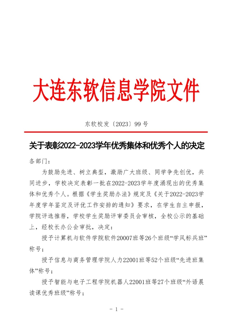 东软校发〔2022〕103号-关于表彰2021-2022学年优秀集体和优秀个人的决定