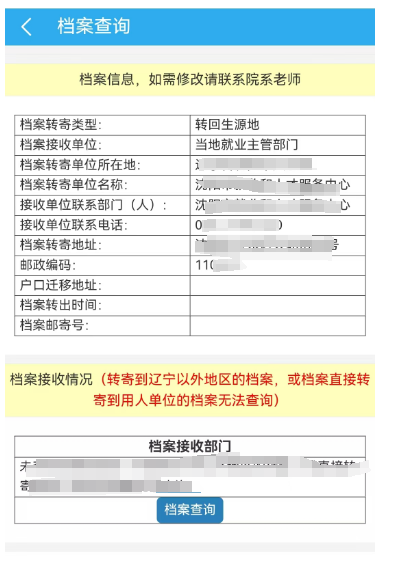 ■档案被派遣到省内的学生,可搜索公众号“就来辽”,关注后点击“就业平台-学生端”后进入学生端主页面,点击“我的”进行登录(如提示未注册,需先在“辽宁省统一身份认证平台”进行注册),点击“档案查询”可以查看档案接收单位信息和转出转入情况。