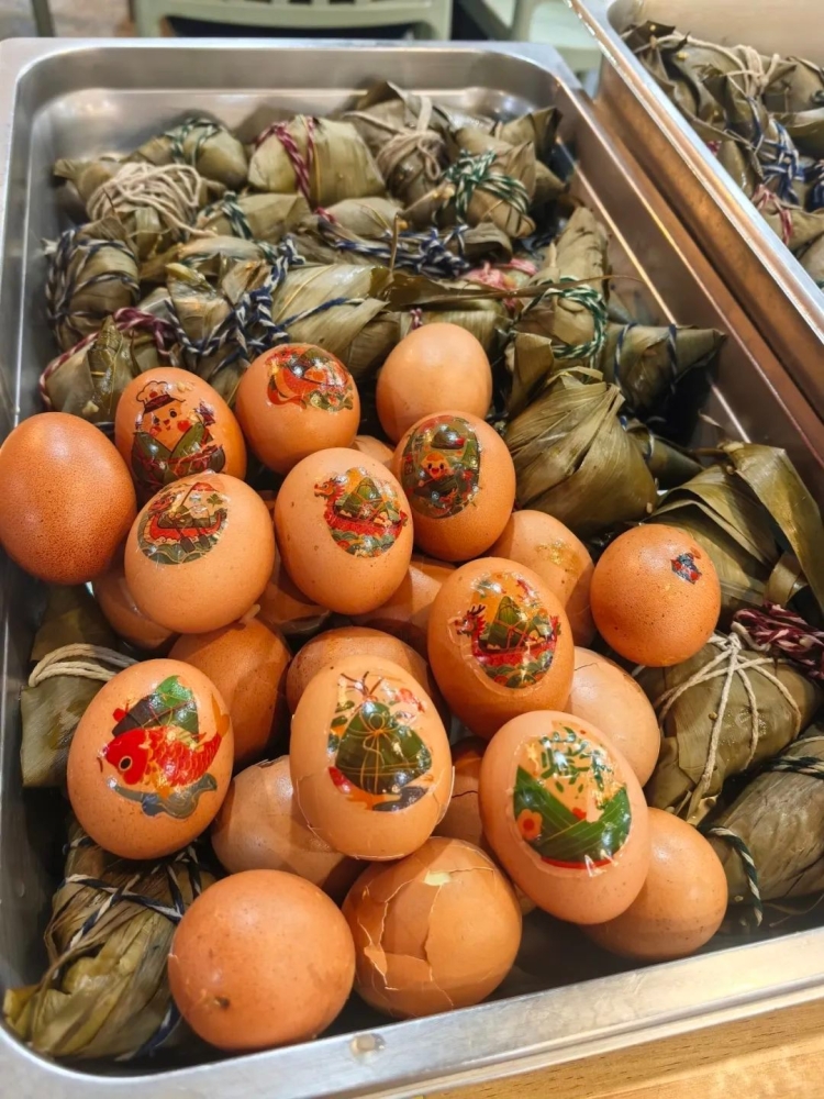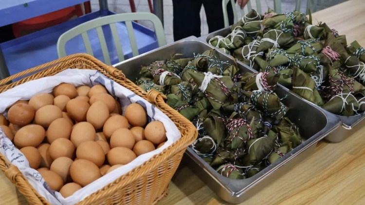 同学们选中自己最心仪的鸡蛋,然后进行涂鸦绘画,兼具艺术性与趣味性,现场气氛十分热烈。粽子与鸡蛋的搭配,更是让端午的节日氛围感十足。