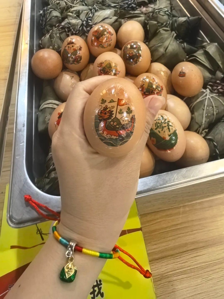 鸡蛋不仅营养美味,还同“吉”音,端午节中人们会将鸡蛋请上餐桌或挂在胸前,寓意“天降吉祥”的美意,寄托着人们对于幸福美好生活的向往。
