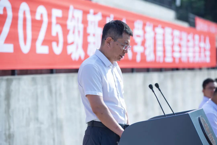 军训团政治委员、学校副校长张晋在会上讲话。他代表学校向2025级新同学的到来表示热烈欢迎和祝贺,向承担新生军训任务的部队全体官兵、全体素质教师致以崇高的敬意,并祝大家教师节快乐!