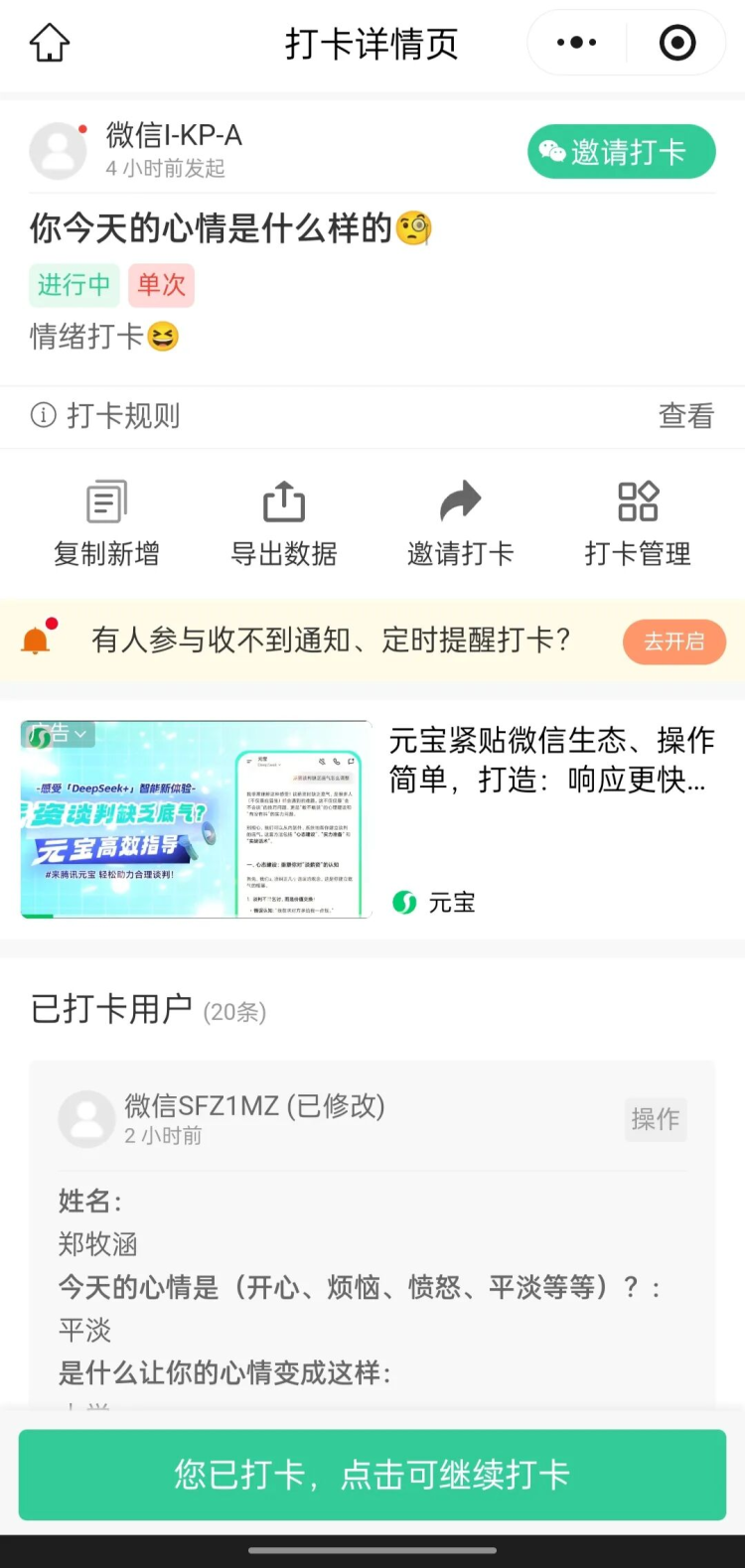 班级心理工作延续“每月心理健康问卷调查”机制,通过班级群发布问卷收集同学心理健康状态,同时在班级群内增设“树洞留言板”小程序收集留言,累计收到12条匿名反馈,均第一时间一对一沟通回应,切实解决同学隐性困扰。