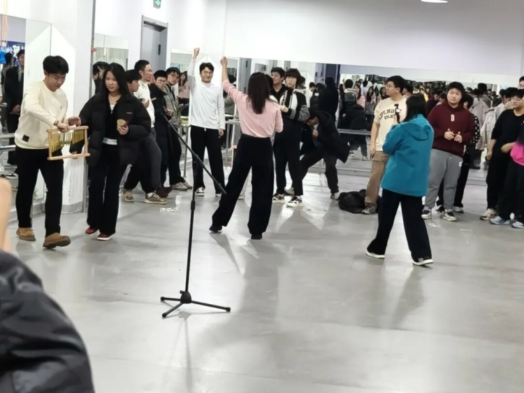 同学们拿起纸杯、鼓、雨棍、沙锤等音乐道具,化身“即兴演奏家”。郑老师指向某组,该组敲出独特节奏;双臂展开,则全场同步合奏。从生疏到默契,从独自敲打到集体共振,同学们在节奏中释放压力,也感受到团队的温暖与归属。